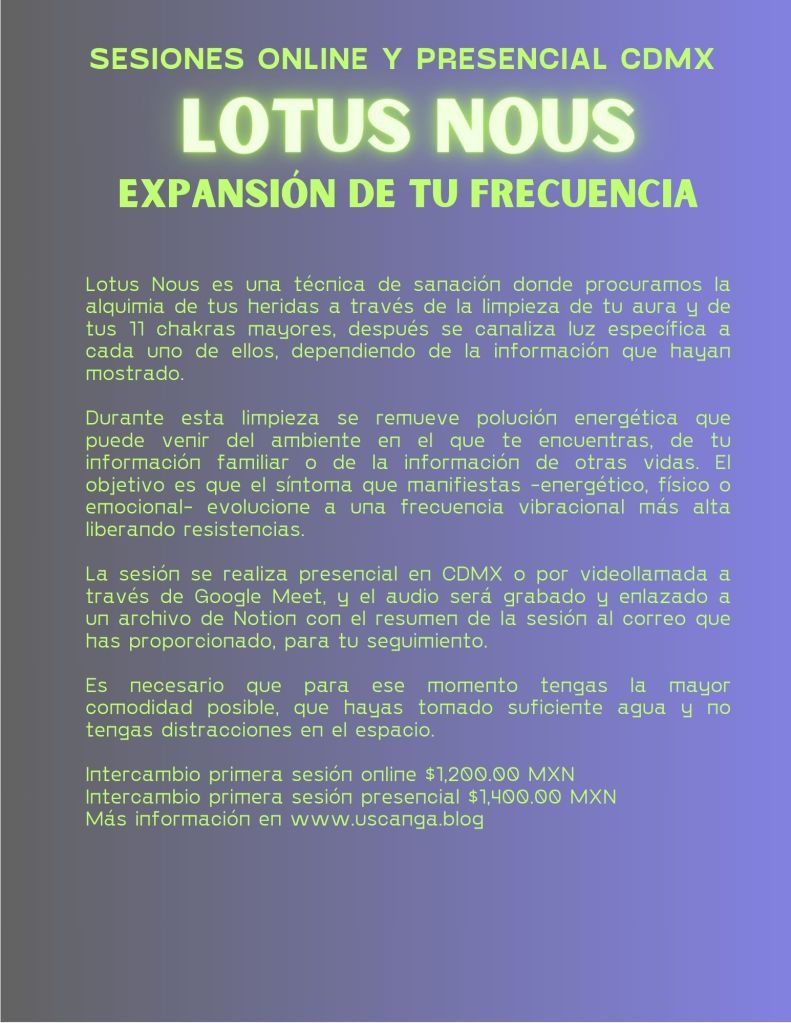 – La sesión Lotus Nous incluye limpieza del aura, de tus 11 chakras mayores y energización de estos chakras, interpretando y removiendo polución.